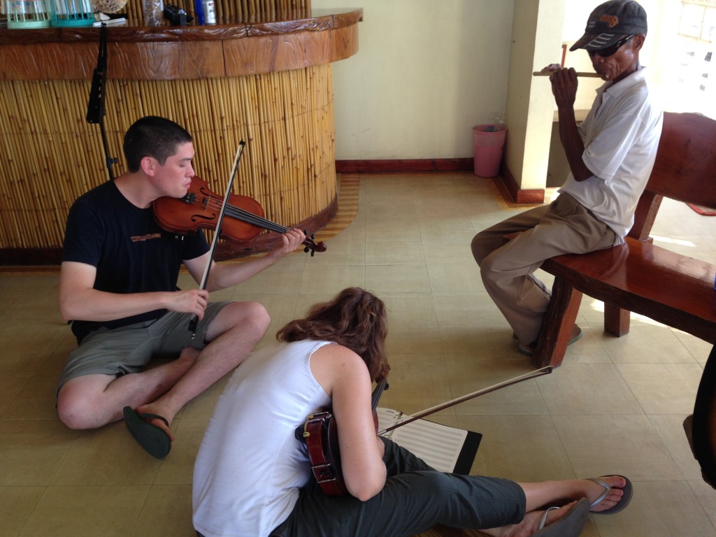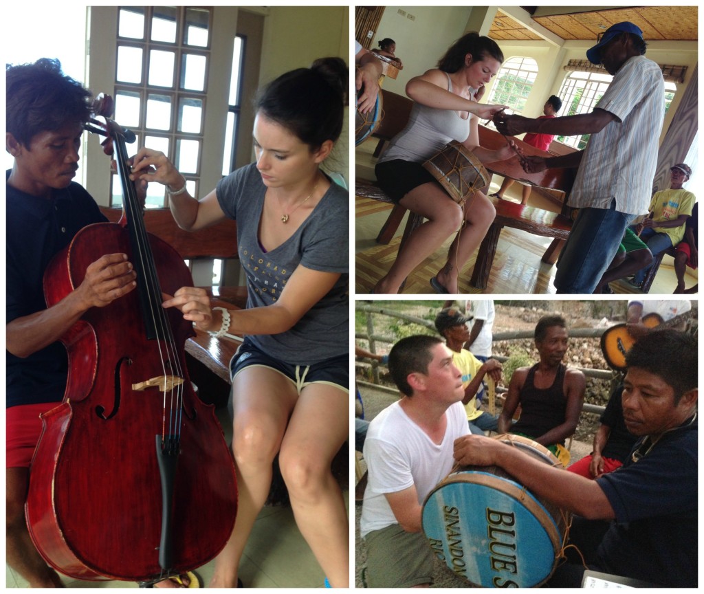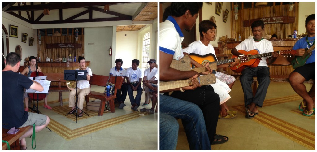 Workshops began with each of the groups performing for the others. The Tagbanua sang their tablay with lyrics in their native Tinagbanua dialect, while CiH musicians played “Ashokan Farewell,” a traditional American folk song. A round of introductions involved each participant telling about his or her musical instrument – how it is played, what it is made of, what its relevance is to their own cultures. In the spirit of openness to learning, they tried each other’s musical instruments too; the Tagbanua enjoyed the opportunity to examine and experiment a little on the Western violin, viola, cello and French horn while CiH musicians did the same to the indigenous drum, tambol, flauta, and yuke.